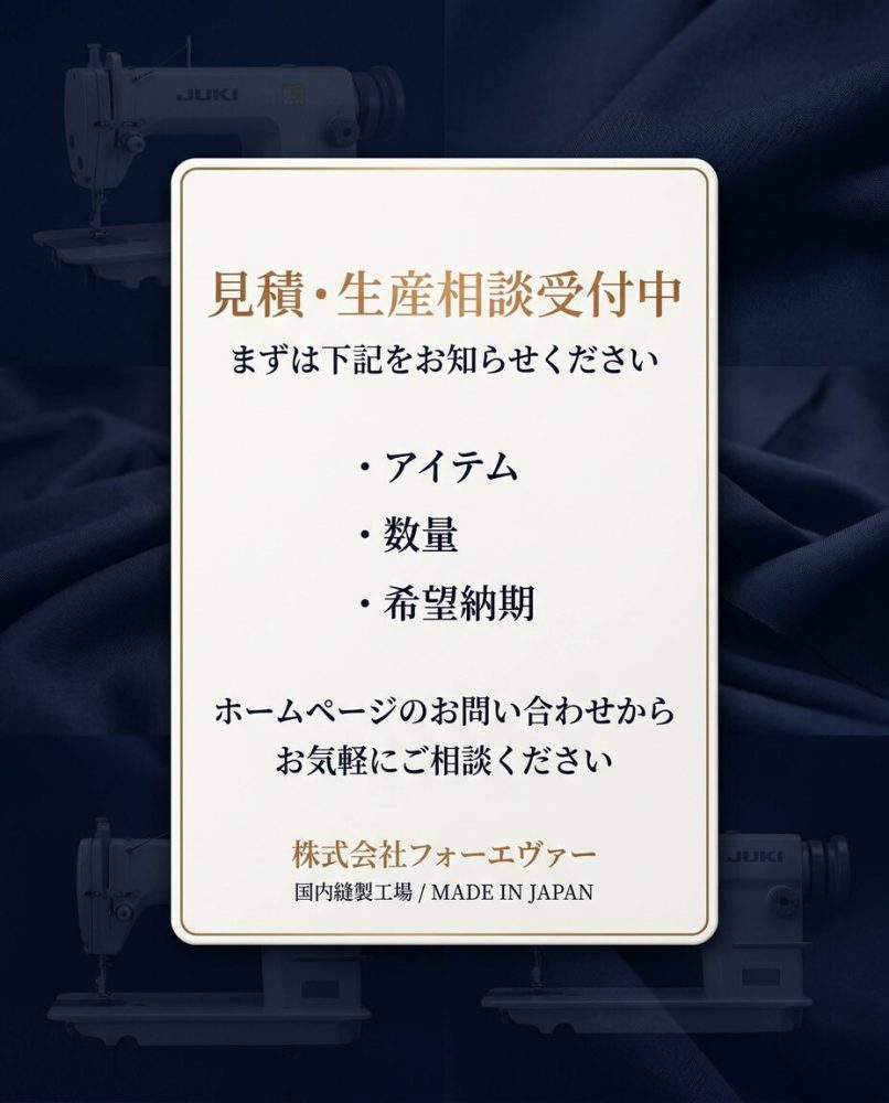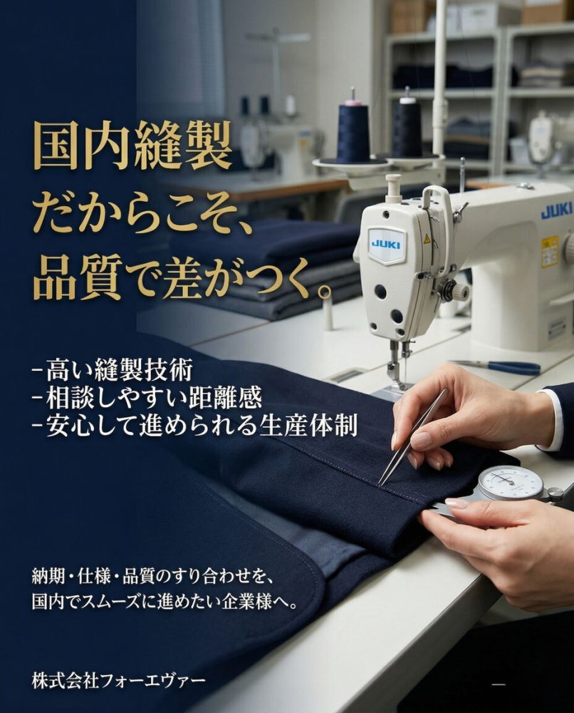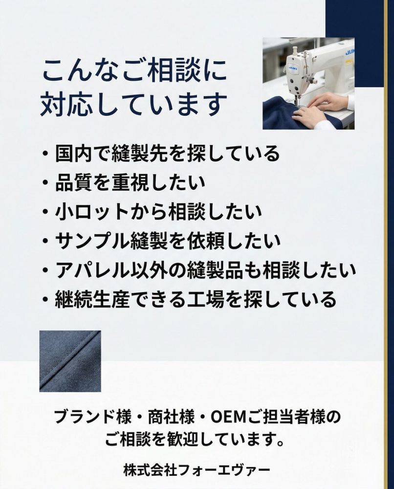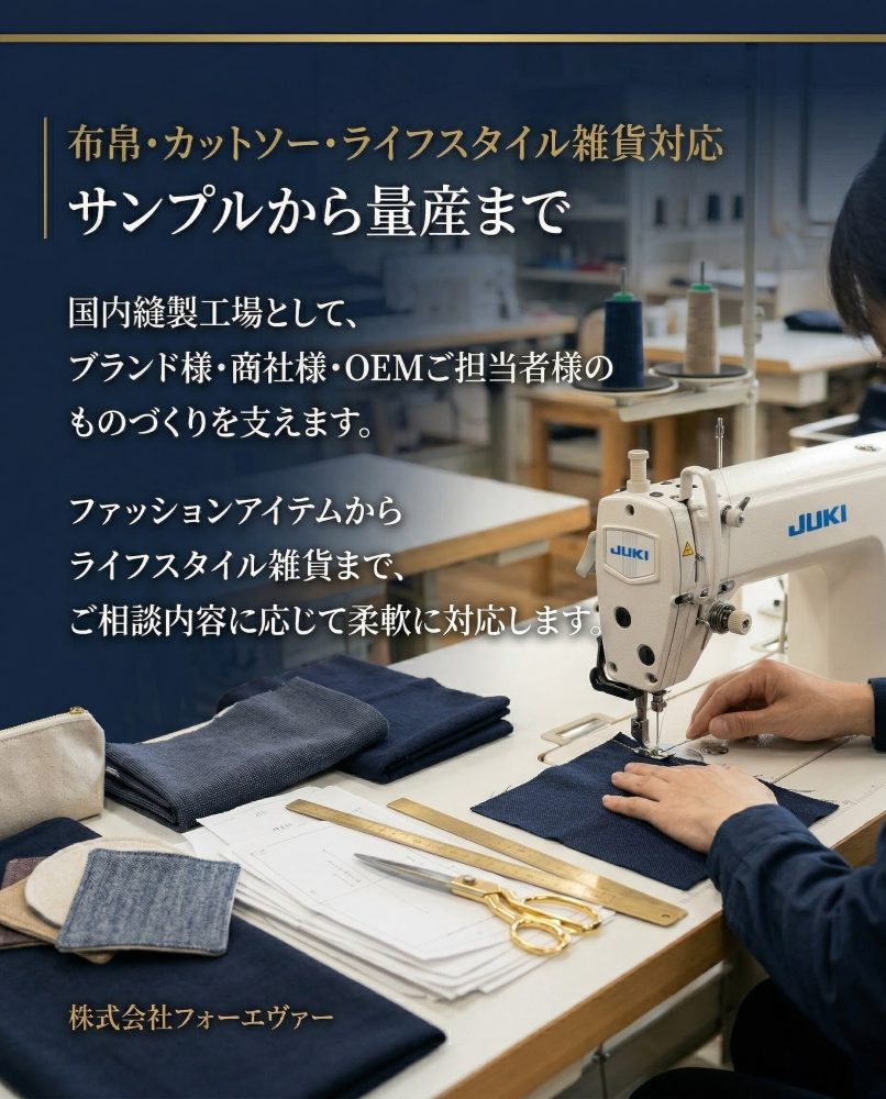 株式会社フォーエヴァーは、国内縫製工場として、ファッションアイテムからライフスタイル雑貨まで幅広いご相談に対応しています。